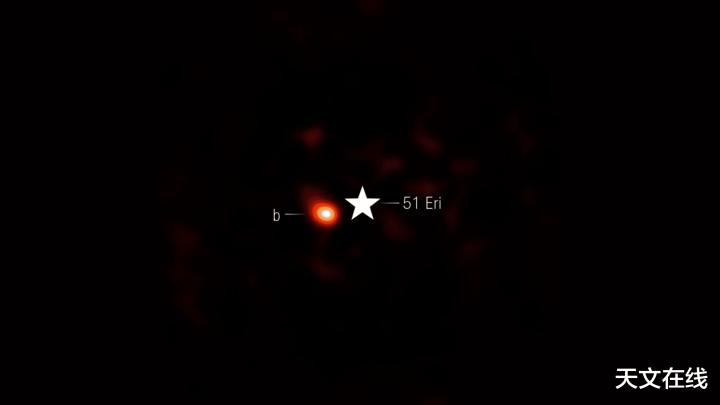 此外,詹姆斯·韦伯太空望远镜还拍摄到了距离我们97光年的恒星系统波江座51(Eridani 51)。该望远镜能够直接为波江座51b成像:这是一颗温度较低的年轻行星,轨道与其主恒星间的距离约为110亿英里(177亿公里),大致相当于海王星和土星运行轨道与太阳间的距离。