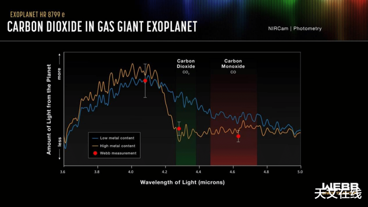 行星之一HR 8799 e的最新二氧化碳探测数据表明该星体大气富含重金属,这与主流的“自下而上式”行星形成理论吻合:由气体和尘埃铺展而成的盘状结构绕新生恒星旋转,在数百万年中坍缩聚合成为行星,这与我们太阳系中行星的形成过程相似。